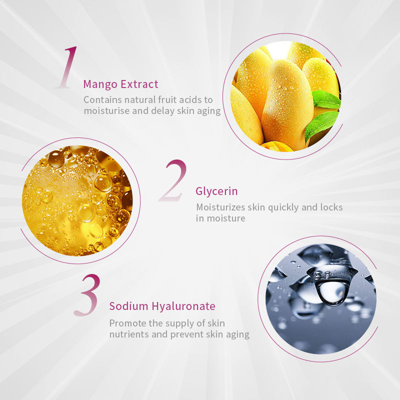 Mango Extract: Rich in vitamins and antioxidants, helps soothe fine lines and dryness caused by dehydration, leaving the eye contour smooth, refined, and delicately soft, awakening a bright and enchanting gaze.